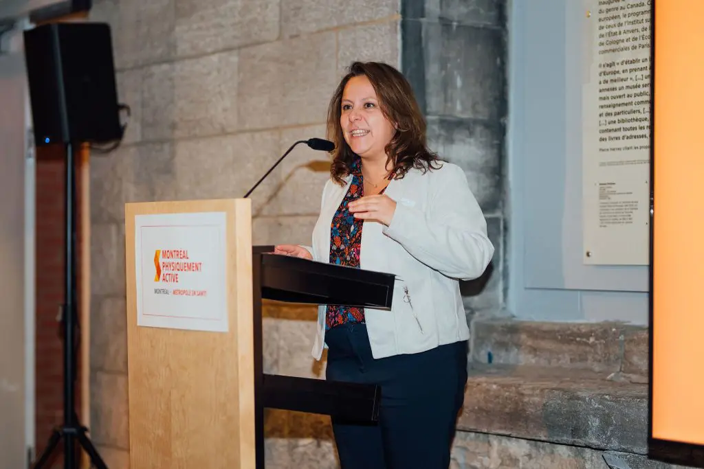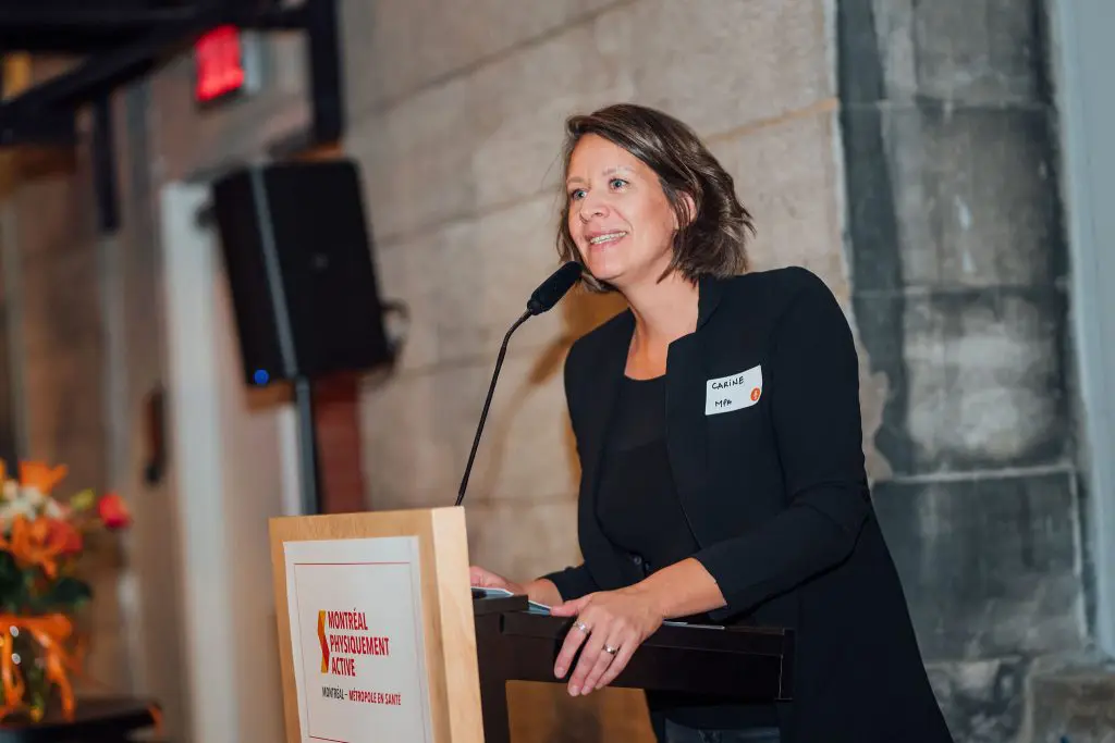 Honorée par sa présence, Carine Thouveny a ensuite transmis le micro à Mme Caroline Bourgeois, vice-présidente du Comité exécutif à la Ville de Montréal responsable des sports et loisirs, d’Espace pour la vie, de la langue française et de l’Est de Montréal et mairesse de l’arrondissement Rivière-des-Prairies–Pointe-aux-Trembles qui a pris la parole pour souligner l’importance de MPA dans le paysage montréalais. Elle a exprimé l’engagement continu de la Ville à soutenir ce réseau, en rappelant que la collaboration entre les institutions et les partenaires de MPA est essentielle pour atteindre les objectifs de la Ville en matière de saines habitudes de vie.