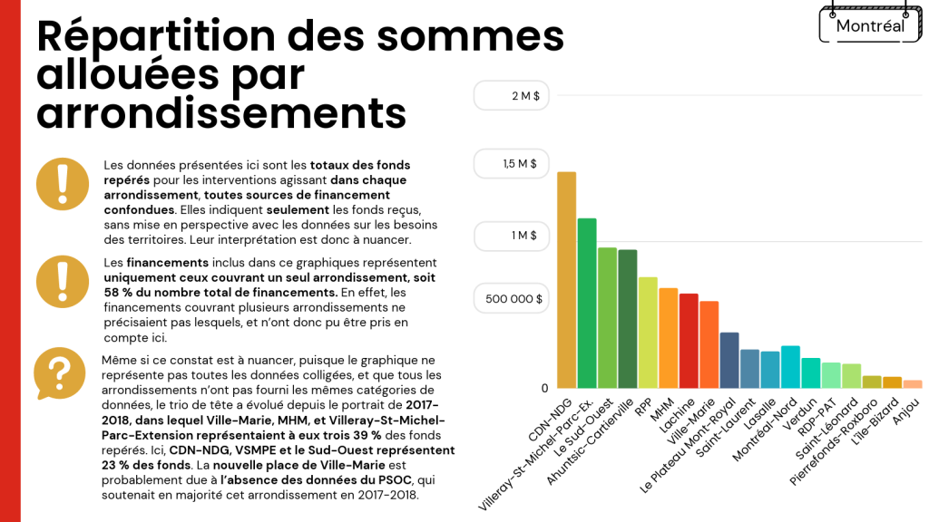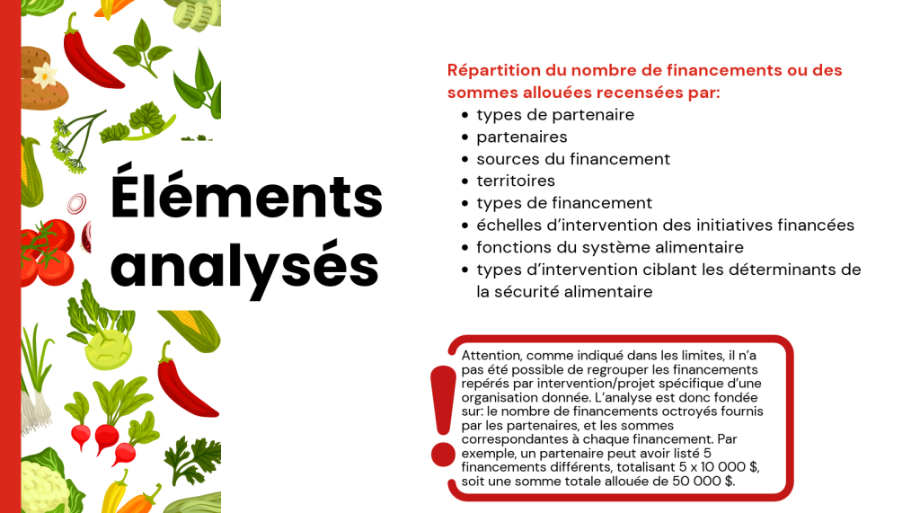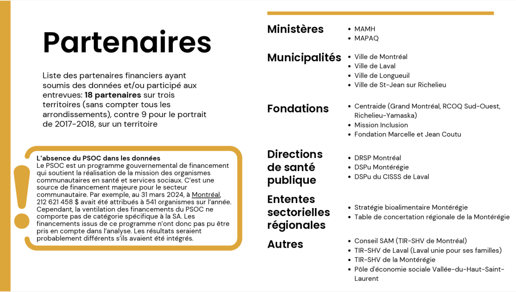 - Pousser la collaboration de « recherche »: élargir le périmètre de ce portrait en intégrant des données socio-démographiques et sur l’insécurité alimentaire, lancer des études sur les zones d’ombre identifiées, bâtir une cartographie élargie des partenaires financiers, etc.