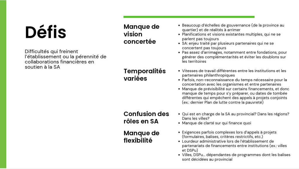 - Des barrières systémiques freinent cependant la collaboration: silos entre les partenaires (ministères, services institutionnels, secteur philanthropique), multiplication des planifications à différentes échelles, cultures organisationnelles variées entre les types de partenaires, qui peuvent compliquer les processus d’arrimage, la communication, et le partage de données.