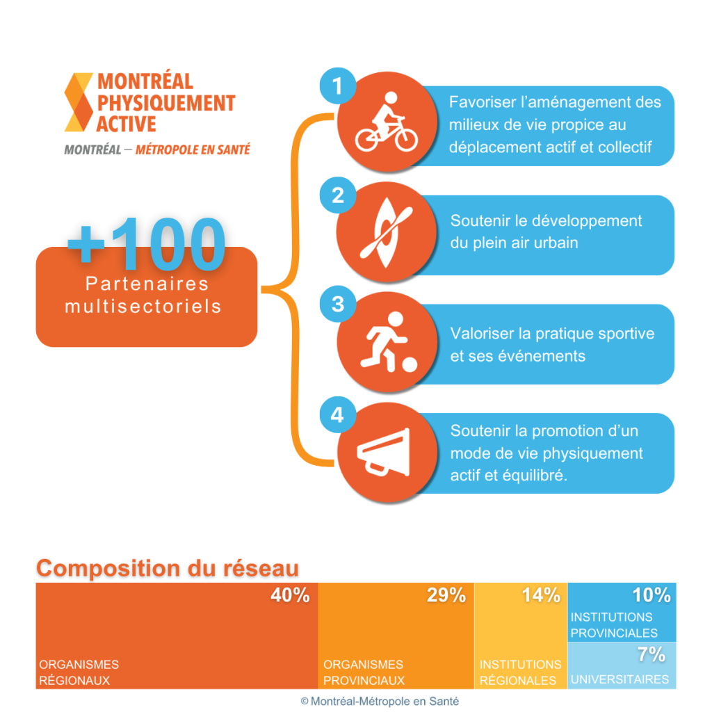 Nos partenaires sont non seulement multisectoriels (organismes, institutions, chaires et des groupes de recherche universitaires), mais aussi multidisciplinaires (mobilité, accessibilité, jeunes, aînés, sports de compétition, loisirs, plein air, santé, sécurité, etc.). C’est ce qui confère à notre réseau son pouvoir d’action, de concertation, d’influence et de rayonnement.